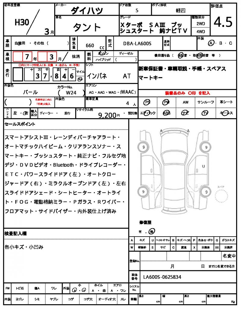 | Grade | Xターボ SA? プッシュスタート 純ナビTV | Model Code | DBA-LA600S |