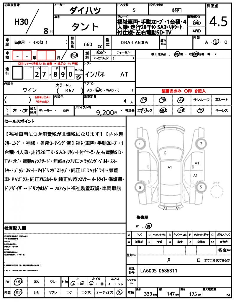 | Grade | 福祉車両・手動スロープ・1台積・4人乗・走行28千K・SA3・リヤシート付仕様・左右電動SD・TV | Model Code | DBA-LA600S |