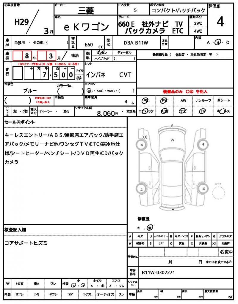 | Grade | 660 E 社外ナビ TV バックカメラ ETC | Model Code | DBA-B11W |