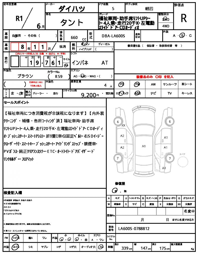 | Grade | 福祉車両・助手席リフトUPシート・4人乗・走行20千K・左電動スライドドア・CDオーディオ | Model Code | DBA-LA600S |