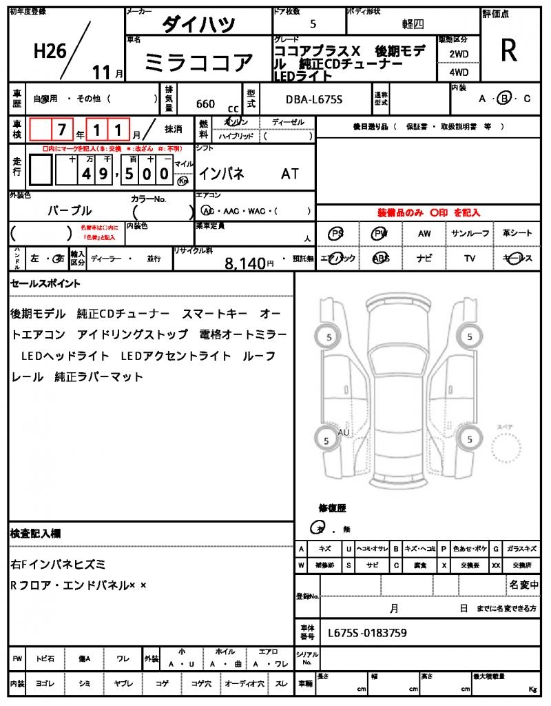 | Grade | ココアプラスX 後期モデル 純正CDチューナー LEDライト | Model Code | DBA-L675S |
