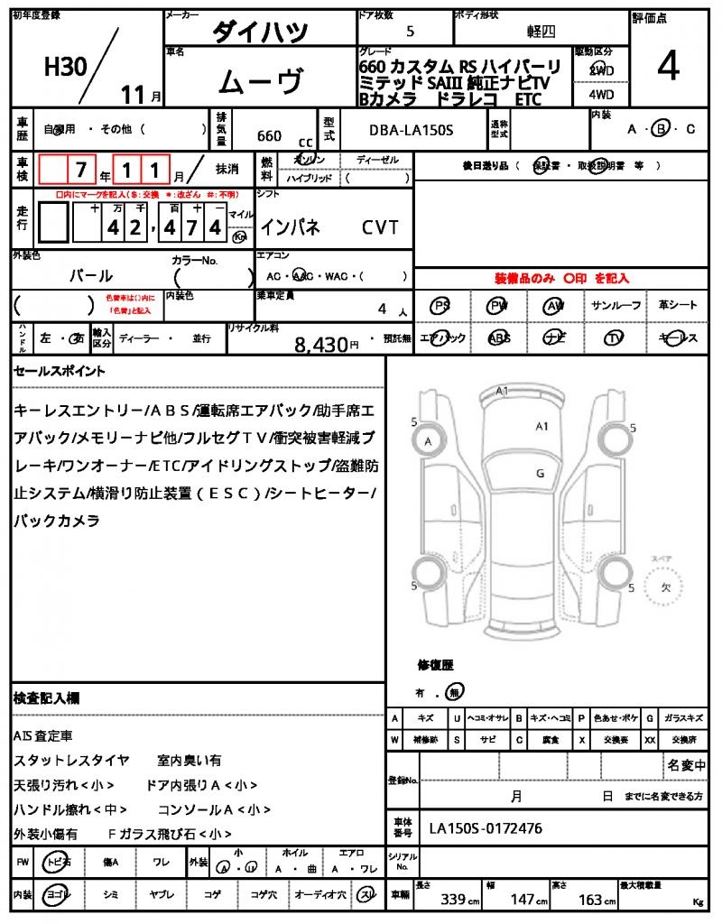 | Grade | 660 カスタム RS ハイパーリミテッド SAIII | Model Code | DBA-LA150S |