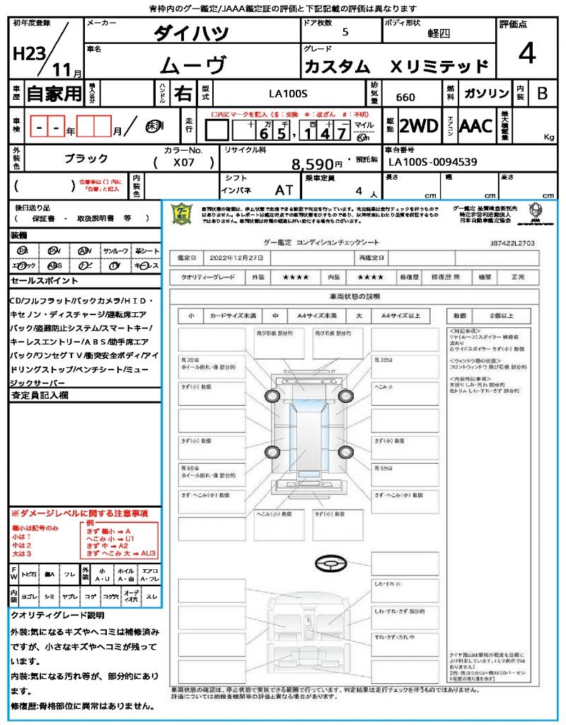 | Grade | カスタム Xリミテッド | Model Code | LA100S |