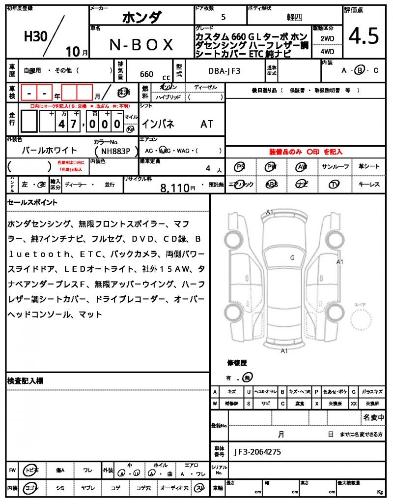 | Grade | カスタム 660 G L ターボ ホンダセンシング | Model Code | DBA-JF3 |