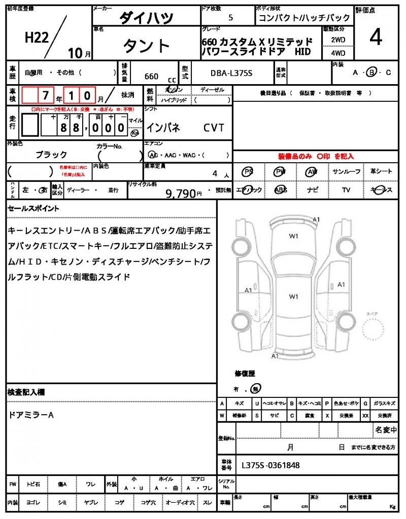 | Grade | 660 カスタム X リミテッド | Model Code | DBA-L375S |