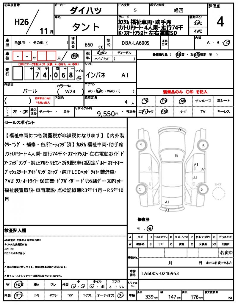 | Grade | カスタム 福祉車両・助手席リフトUPシート・4人乗・走行74千K・スマートアシスト・左右電動SD | Model Code | DBA-LA600S |