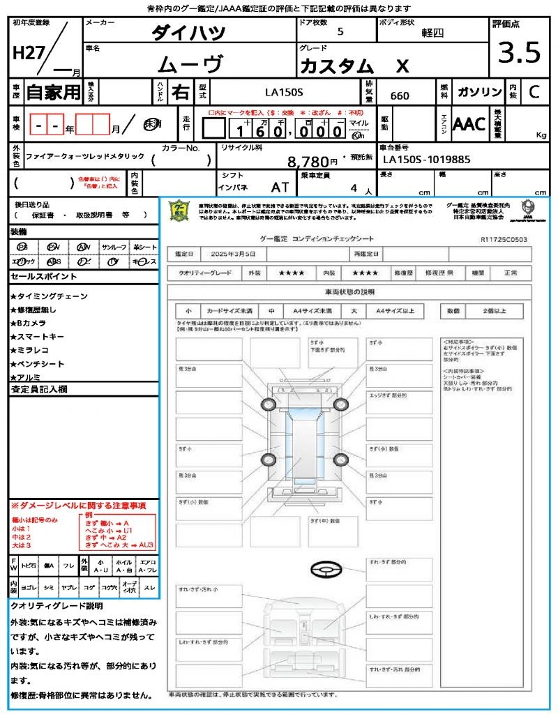 | Grade | カスタム X | Model Code | LA150S |