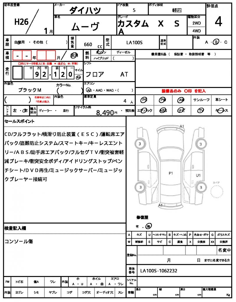 | Grade | カスタム X SA | Model Code | LA100S |