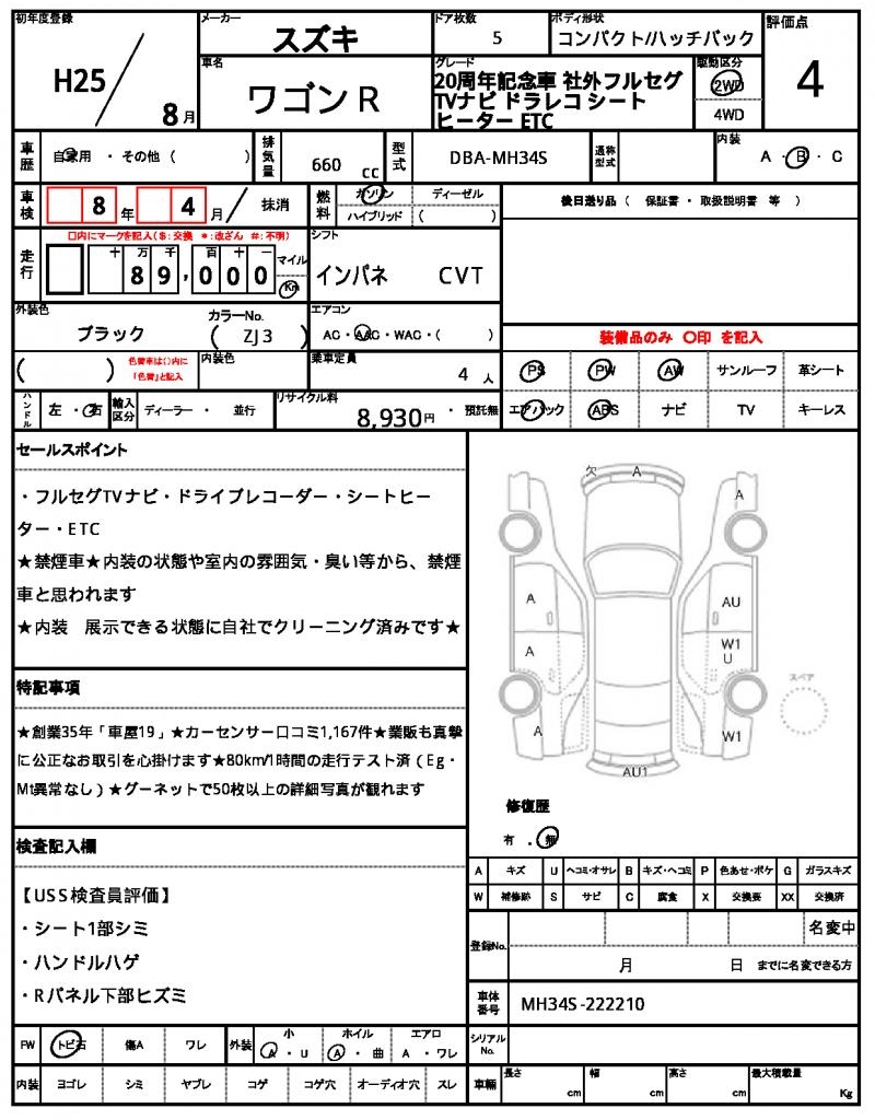 | Grade | 20周年記念車 社外フルセグTVナビ ドラレコ シートヒーター ETC | Model Code | DBA-MH34S |