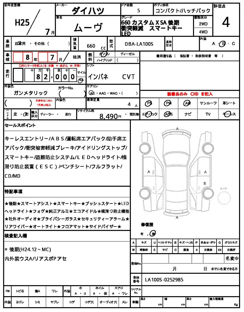 | Grade | 660 カスタム X SA | Model Code | DBA-LA100S |