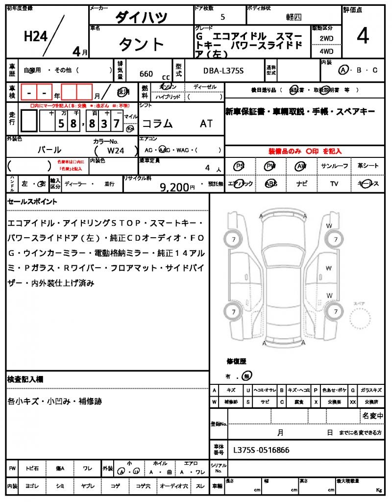 | Grade | G エコアイドル スマートキー パワースライドドア(左) | Model Code | DBA-L375S |