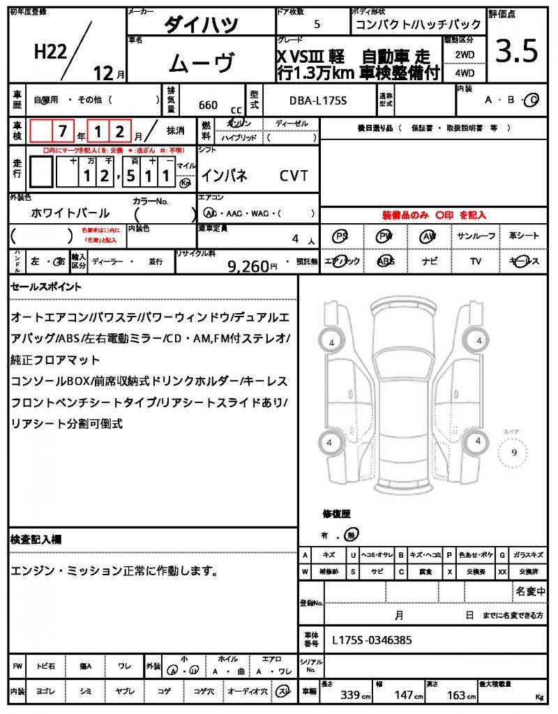 | Grade | X VS? 軽 自動車 | Model Code | DBA-L175S |