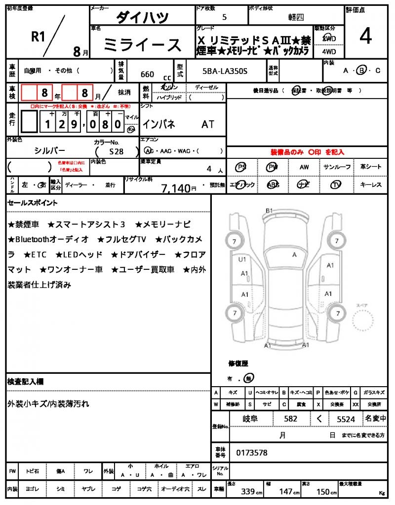 | Grade | X リミテッドSA?★禁煙車★メモリーナビ★バックカメラ | Model Code | 5BA-LA350S |