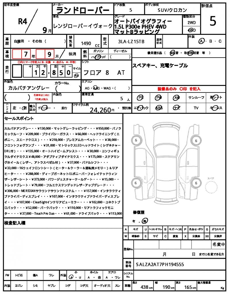 | Grade | オートバイオグラフィー 1.5L P300e PHEV 4WD マットBラッピング | Model Code | 3LA-LZ15TB |