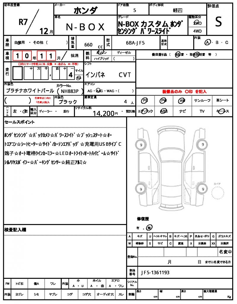 | Grade | N-BOX カスタム | Model Code | 6BA-JF5 |