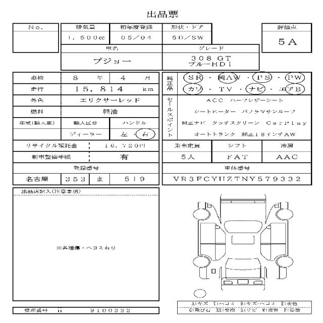 | Grade | プジョー 308 GT ブルーHDi | Model Code | 3DA-P52YH01 |