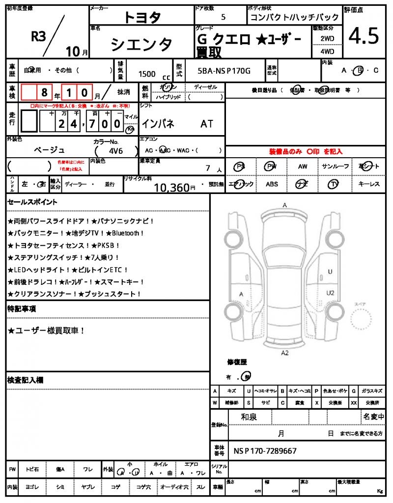 | Grade | G クエロ ★ユーザー買取 | Model Code | 5BA-NSP170G |