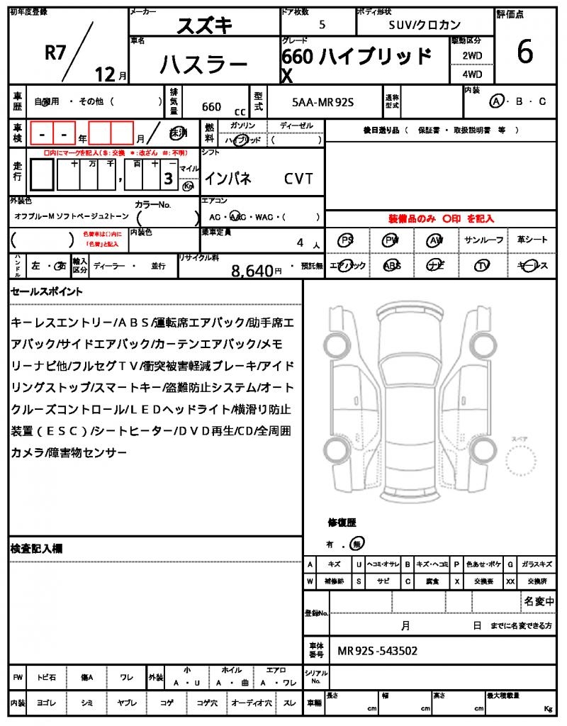 | Grade | 660 ハイブリッド X | Model Code | 5AA-MR92S |
