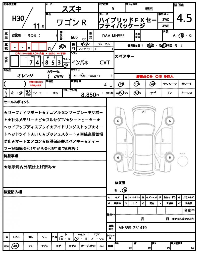 | Grade | ハイブリッドFXセーフティパッケージ | Model Code | DAA-MH55S |