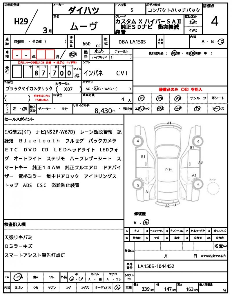 | Grade | カスタム X ハイパーSA? 純正SDナビ 衝突軽減装置 | Model Code | DBA-LA150S |