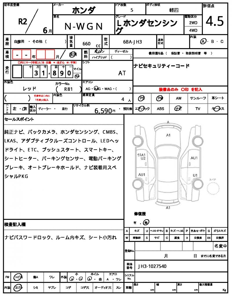 | Grade | Lホンダセンシング | Model Code | 6BA-JH3 |