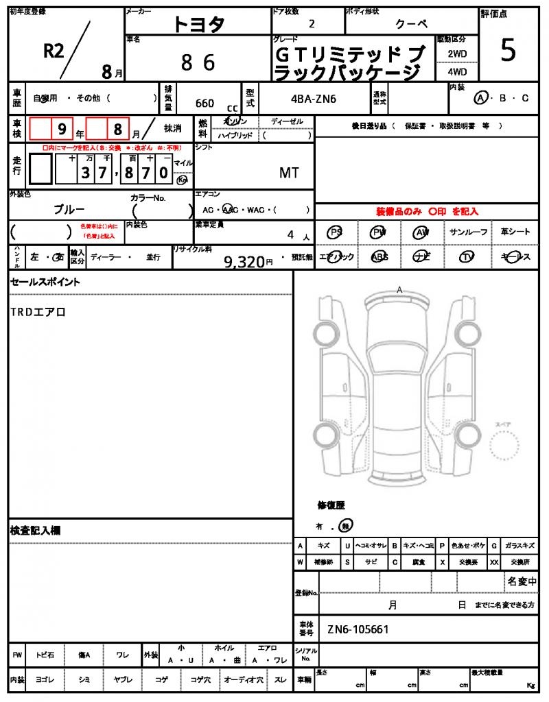 | Grade | GTリミテッド ブラックパッケージ | Model Code | 4BA-ZN6 |