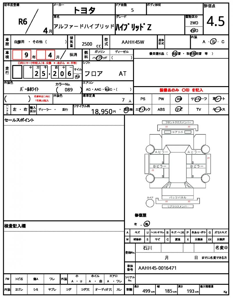 | Grade | ハイブリッドZ | Model Code | AAHH45W |