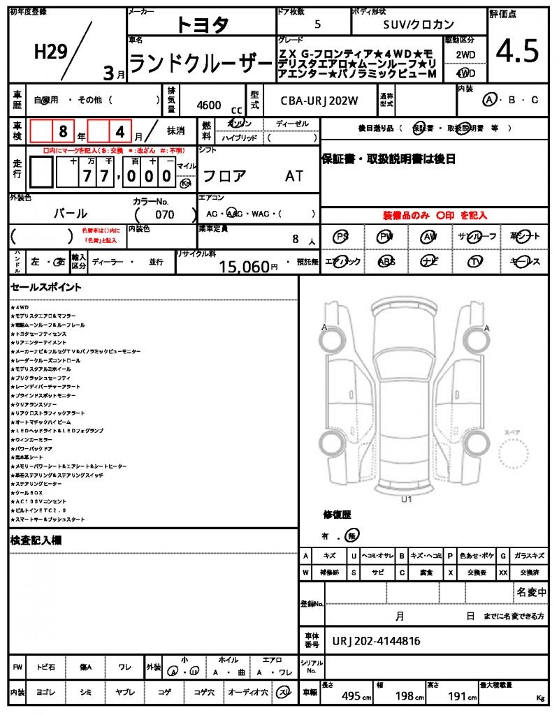 | Grade | ZX G−フロンティア★4WD★モデリスタエアロ★ムーンルーフ★リアエンター★パノラミックビューM | Model Code | CBA-URJ202W |