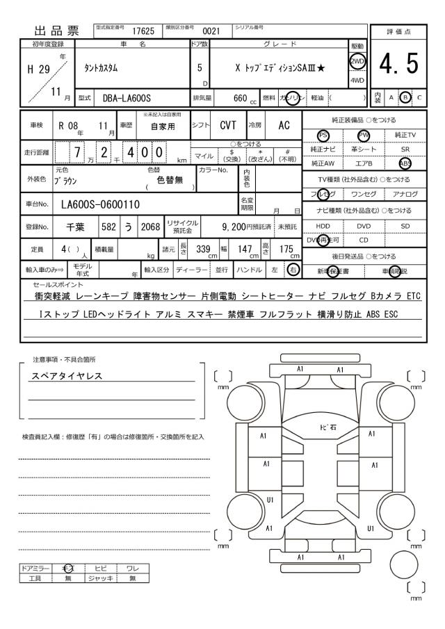 | Grade | カスタムX トップエディションSAIII | Model Code | DBA-LA600S |