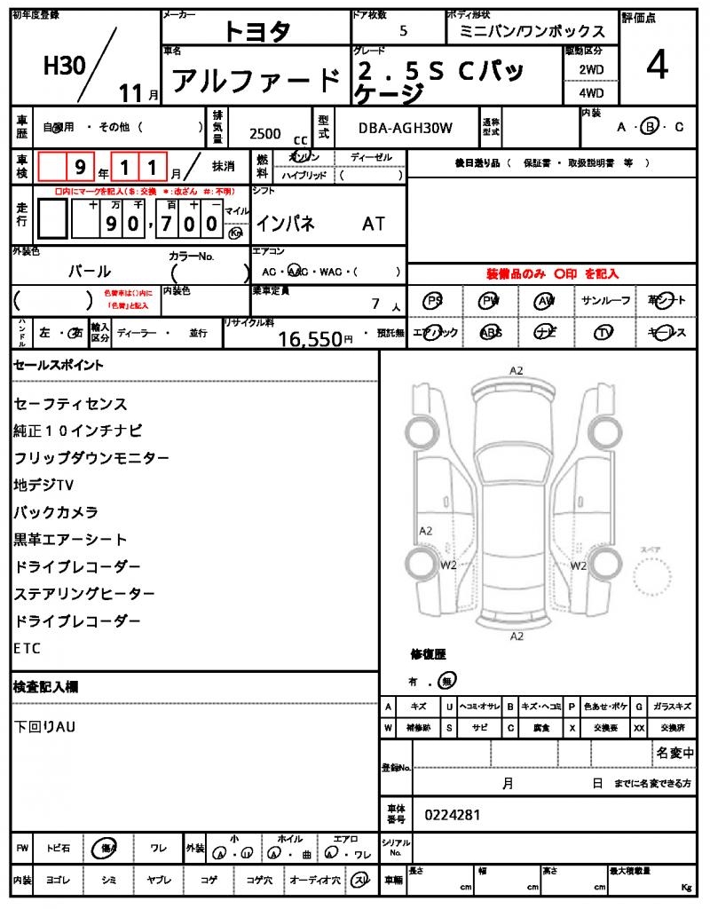 | Grade | 2.5S Cパッケージ | Model Code | DBA-AGH30W |