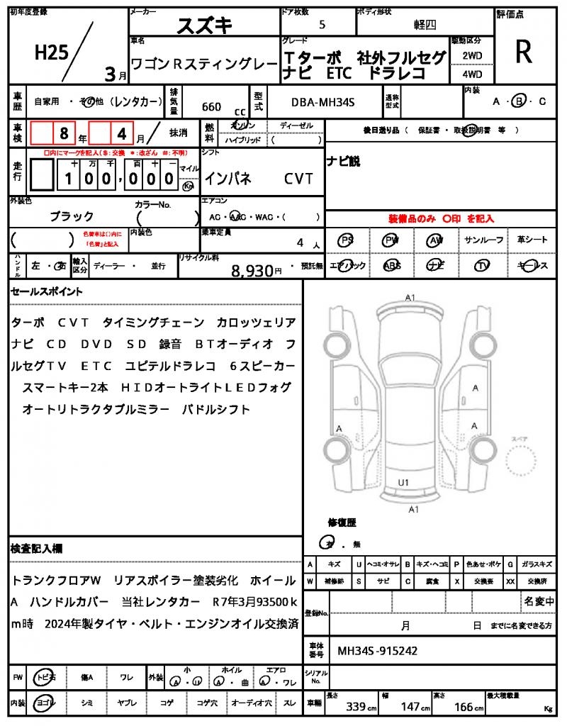 | Grade | Tターボ 社外フルセグナビ ETC ドラレコ | Model Code | DBA-MH34S |