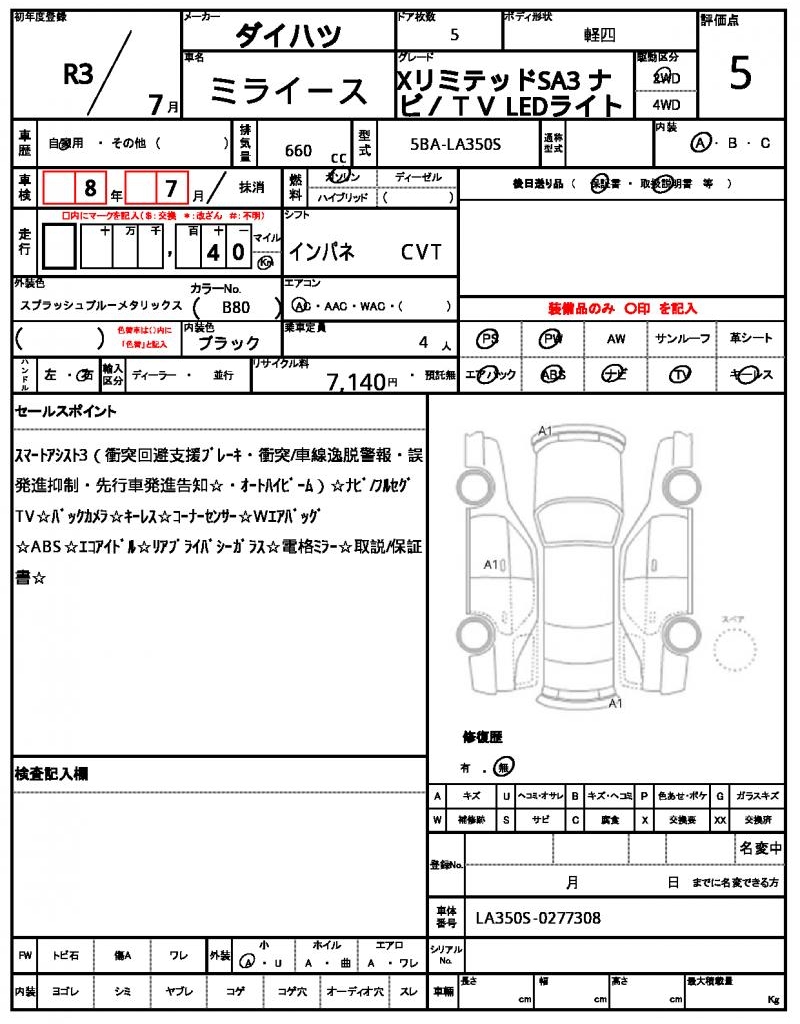 | Grade | XリミテッドSA3 | Model Code | 5BA-LA350S |