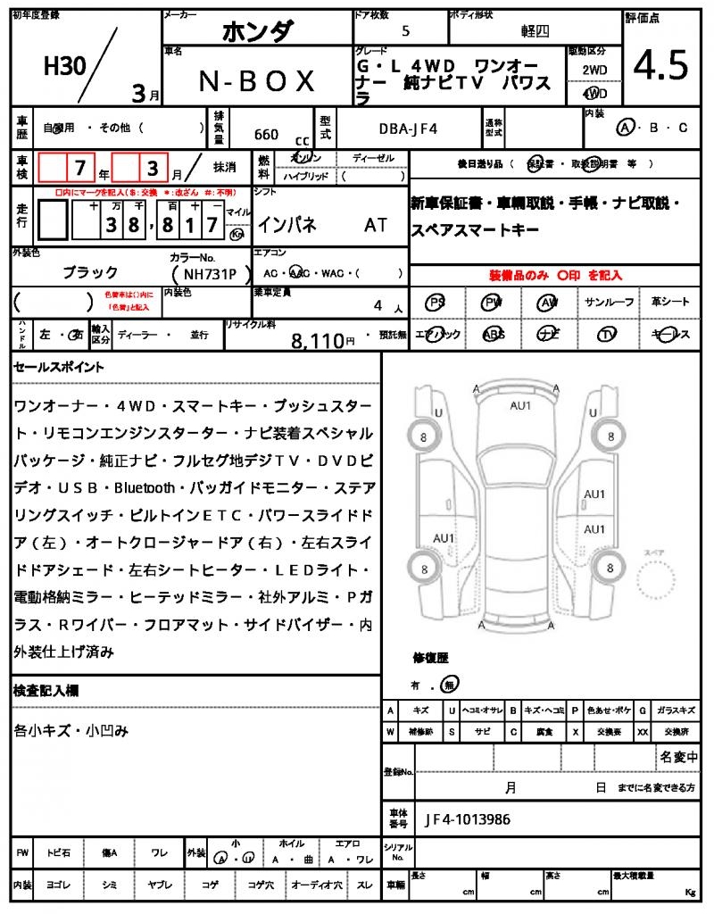 | Grade | G・L 4WD ワンオーナー 純ナビTV パワスラ | Model Code | DBA-JF4 |